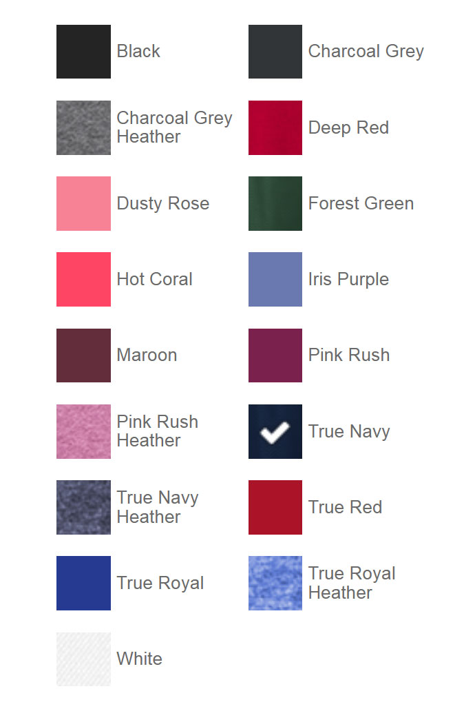 | Color | Black, Maroon, White, Charcoal Grey, Charcoal Grey Heather, Deep Red, Dusty Rose, Forest Green, Hot Coral, Iris Purple, Pink Rush, Pink Rush Heather, True Navy, True Navy Heather, True Red, True Royal, True Royal Heather |