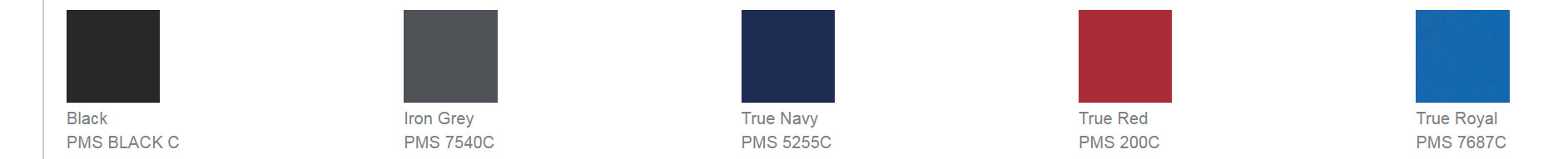 | Color | Black, Iron Grey, True Navy, True Red, True Royal |